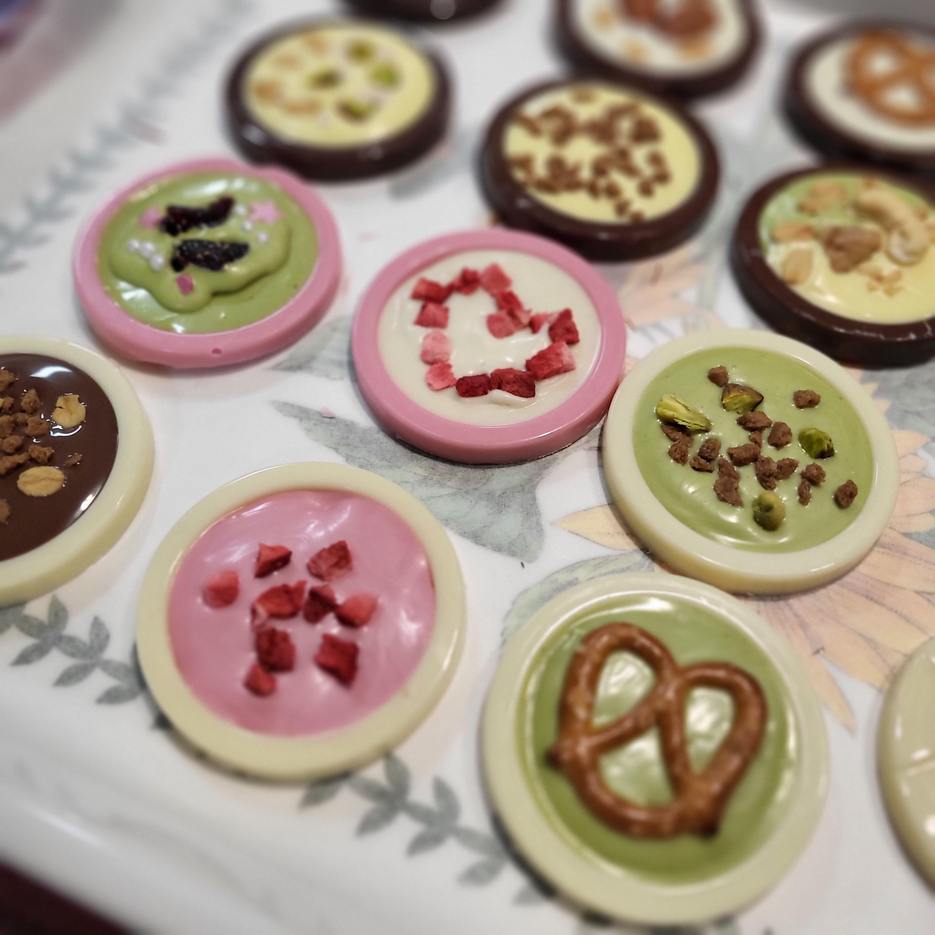 요 모양의 몰드는 일단 배경 초콜릿을 먼저 만든 후, 한번 얼리고 꺼낸 후에 앞면에 다시 초콜릿을 부어야 합니다. 여기서 주의할 점은 한 번에 다 붓지 마시고, 한 두개씩 붓고 토핑 올리고를 반복하셔야해요. 아니면 굳어서 토핑이 안올라가요. 그리고 나서 다시 냉동실로 Go go
