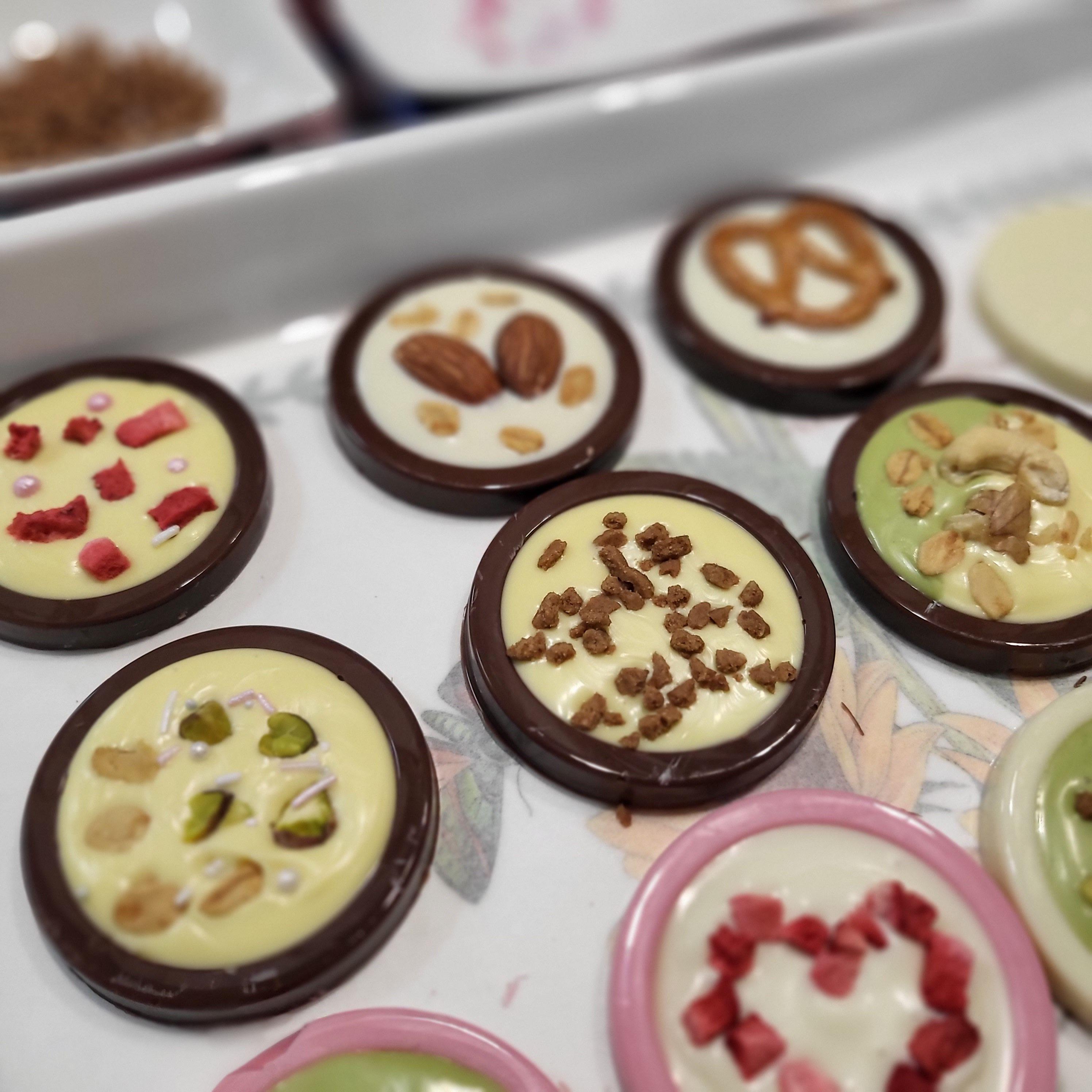요 모양의 몰드는 일단 배경 초콜릿을 먼저 만든 후, 한번 얼리고 꺼낸 후에 앞면에 다시 초콜릿을 부어야 합니다. 여기서 주의할 점은 한 번에 다 붓지 마시고, 한 두개씩 붓고 토핑 올리고를 반복하셔야해요. 아니면 굳어서 토핑이 안올라가요. 그리고 나서 다시 냉동실로 Go go
