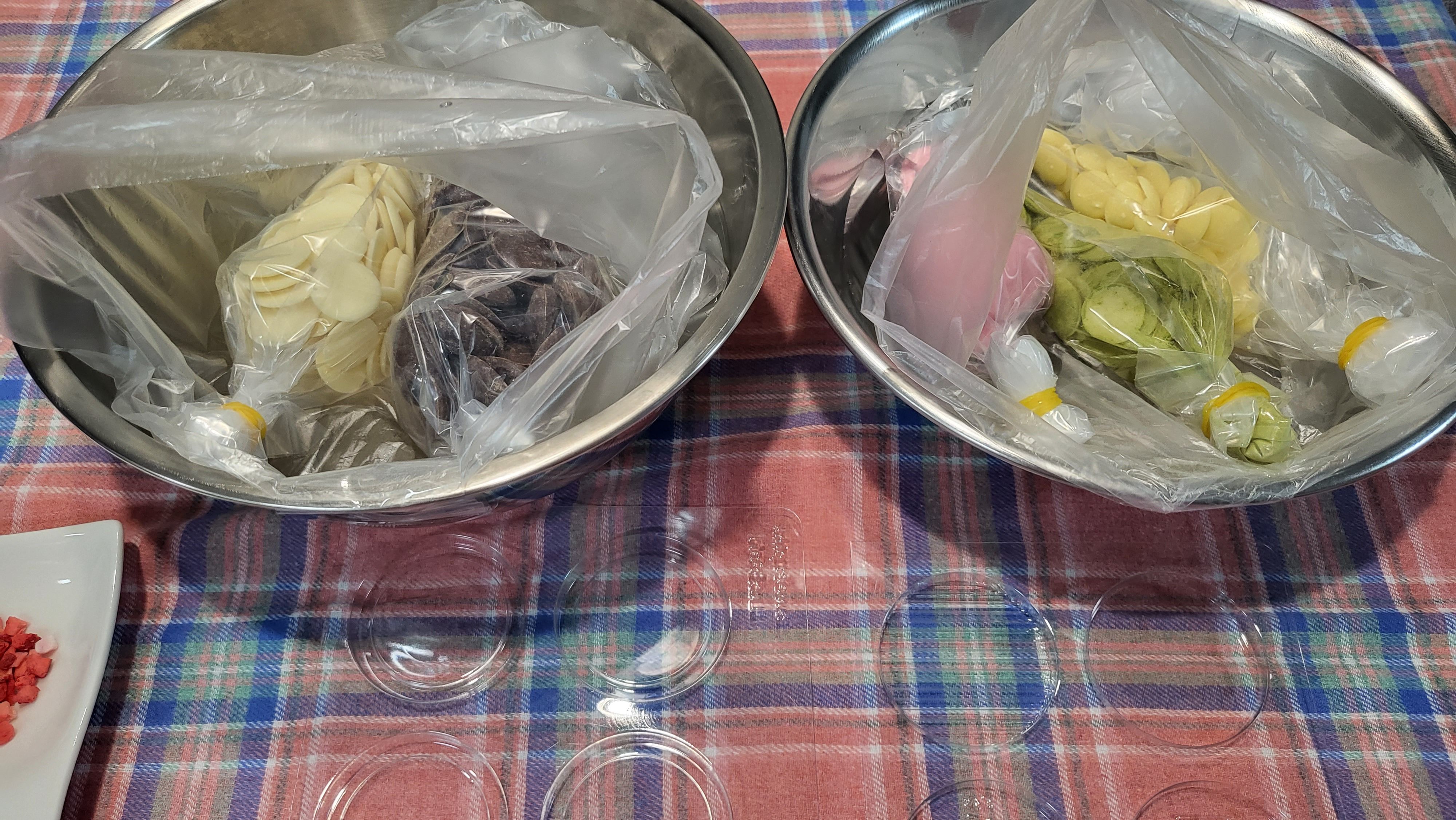 이건 정말 Tip이네요, 사용 설명서에 적혀 있는데 초콜릿 중탕할 때 볼에 뜨거운 물을 넣고 비닐봉지를 고정해 줘요, 그 안에 짤주머니 초콜릿들을 넣어 주는 거예요. 그러면 물기가 없어서 손에 묻지도 않고 편하고 좋더라구요. 꼭 이렇게 해보세요
